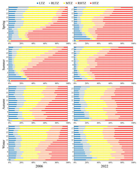 In 2006, the areas of the LTZ in spring and autumn were 413.14 km2 and 592.19 km2, respectively, whereas the HTZ covered 295.05 km2 and 508.62 km2, respectively. By 2022, the areas of the LTZ in spring and autumn had decreased to 318.07 km2 and 548.68 km2, respectively, while those of the HTZ had increased to 574.31 km2 and 567.48 km2, respectively. Between 2006 and 2022, the LTZ areas in summer and winter decreased by −69.14 km2 and 42.78 km2, respectively, corresponding to reduction rates of −17.30% and 7.51%, respectively. In contrast, the areas of the HTZ in summer and winter increased by 223.94 km2 and 198.80 km2, respectively, reflecting growth rates of 50.91% and 50.73%, respectively. In spring and autumn, the reduction rates for the LTZ were 29.89% and 7.93%, respectively, while the growth rates for the HTZ were 94.65% and 11.57%, respectively (Table 2).