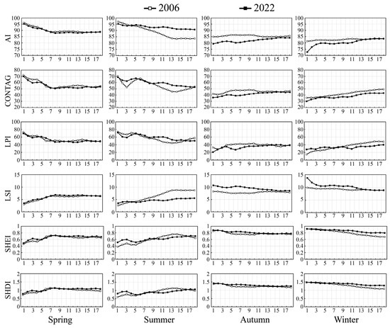 Overall, from 2006 to 2022, the SHEI and SHDI in spring, summer, autumn, and winter exhibited relatively consistent trends. Additionally, the trends of different landscape pattern indices in spring were largely the same, but within the 2–4 km and 12–14 km ranges from the center point, the heat island patches were diverse but relatively independent. Within the 10–15 km gradient range from the center point in summer, the heat island patches were more aggregated and continuous, with its prominent dominant patches and more regular and unified shapes and types. Within the 5–8 km gradient range from the center point, the aggregation connectivity of autumn heat island patches declines, and the dominant ones weaken, yet their shapes and types grow increasingly diverse and balanced. Within the 10–18 km gradient range from the center point, the connectivity of winter heat island patches drops, and the dominant ones weaken.