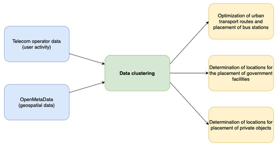 The analyzed data include information on the total number of unique users in each quadrant; the number of users in “home locations” (when users are present in the evening and at night); and the number of users in work locations (when users are active during the day). The integration of spatial data and user activity information was performed using clustering methods. The results of the analysis helped identify areas of high population activity, which is valuable for optimizing transport routes, locating government facilities, and developing private infrastructure. Figure 1 shows a diagram of the research workflow, demonstrating the integration of telecom operator data and geospatial information for cluster analysis purposes.