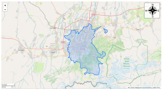 - Geographic data on the boundaries of Almaty, its road infrastructure, buildings, and other objects (current as of 7 October 2023) were extracted from OpenStreetMap (OSM). These data served as the basis for visualizing the boundaries of Almaty (Figure 2) and for further spatial analysis.