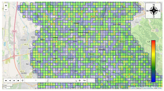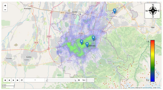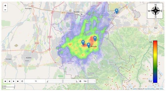 The heat map-based approach has proven effective in studying spatial patterns of urban population aggregation. For instance, a study [25] utilized heat map analysis to determine the density and distribution of Almaty’s population, enabling the identification of key areas of population concentration and activity using OSM data and aggregated data from a telecom operator. A similar approach in our study provides a detailed understanding of population density and activity distribution across different parts of the city, forming a foundation for more accurate decision-making in urban planning and infrastructure development.