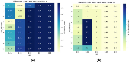 Heat maps of DBSCAN algorithm parameter estimation: (a) silhouette coefficient; (b) Davis–Bouldin index.