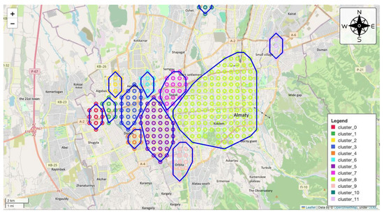 Based on OSM data and mobile phone density data, a clustering map that identifies twelve areas within the city exhibiting consistently high population density was constructed, regardless of the time of day (see Figure 8). This demonstrates the effectiveness of the DBSCAN algorithm in clustering urban population density data, which are characterized by high spatial heterogeneity, variable point density, and the absence of clearly defined boundaries between activity zones.