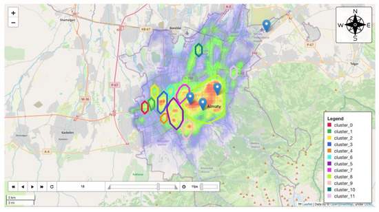 A comparison of the clustering maps constructed for different time intervals allowed us to analyze the dynamics of population activity within the static clusters throughout the day. To achieve this, the cluster boundaries were overlaid on an activity heat map (see Figure 9). The analysis revealed that between 14:00 and 14:59, the highest load falls on clusters located in commercial and business districts, likely due to the lunch break. In the evening, between 18:00 and 18:59, the load is redistributed, reflecting the end of the workday and the movement of the population toward residential and recreational areas. The alignment of the cluster boundaries with the zones of highest population density confirms both the accuracy of their delineation and the adequacy of the chosen clustering method.