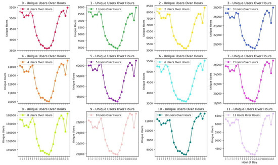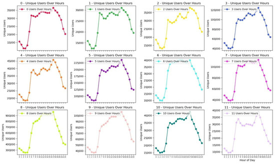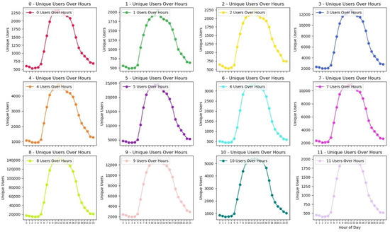 As part of the study, a detailed analysis of the temporal dynamics of unique user activity within various clusters identified by the DBSCAN algorithm was performed. For each cluster, graphs were created to depict changes in the total number of unique users throughout the day (Figure 9, Figure 10 and Figure 11). The X-axis on the graphs represents the hours of the day (from 0 to 23), while the Y-axis indicates the total number of unique users at each specified hour. The graph colors correspond to the colors of the clusters shown in Figure 7 and Figure 8.