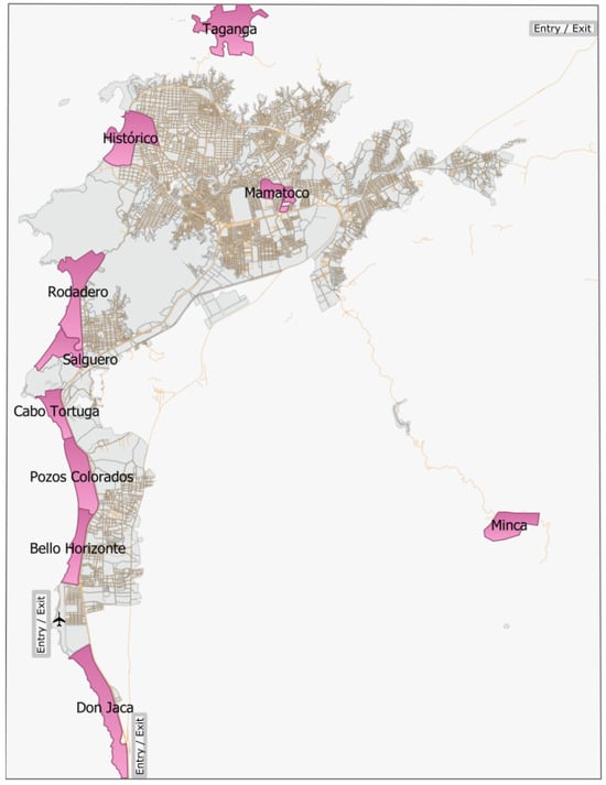 For the blocks (MZs), the most important spatial unit of the model, the input data were obtained from GIS files. The base layer is the Colombian Geostatistical Framework for the 2018 census of DANE [44]; this base provided census information on the number of residents for each MZ, and the MZ that has temporary housing. The Santa Marta Land Management Plan (2020–2032) generated a spatial category called zones of tourist interest (ZITs), which are spaces of importance for the city’s tourist activity. This information is an input for the model to select the MZ that are part of the ZIT. Geographic data were obtained from Fundación OpenStreetMap [45], and the variables obtained were: (1) MZ lodging (MZs with places of lodging), enriched with information from MZs that have temporary housing from DANE [44] and are located within a ZIT; (2) MZs with sites of tourist interest (SIT MZs) and associated attributes, enriched with the Magdalena Tourist Guide, prepared by MinCIT [46]; and (3) Santa Marta road network.