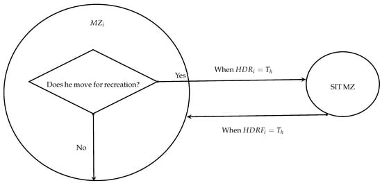 The residents have a home MZ (); those who move for recreation randomly select a recreation SIT MZ (), travel to that destination in one hour (), and have one hour to return to their residence (). The residents have an objective (), which indicates the activity they are doing. This can be: resting (when they are in the residence) or recreating (when they are in the recreation SIT). In summary, the residents, considering their objective and the time (), move or not, at the times established for each activity. It is important to mention that residents who move for recreation travel in groups of size S (see Figure 4).