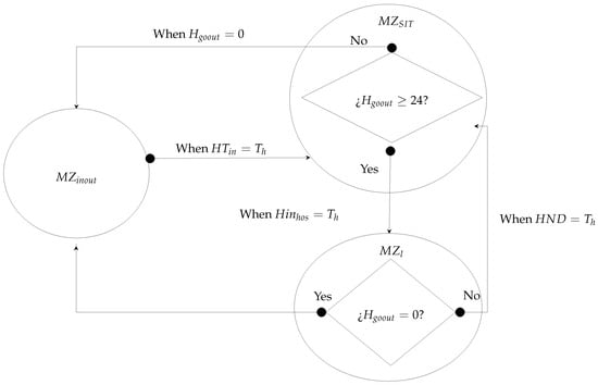 For their part, tourists enter Santa Marta for one MZ of entry (), and they move in groups of different sizes () to the MZ-SIT to visit () at a given hour (). They have a duration at the destination (): if , then the tourist spends the night in a lodging MZ () which the tourist enters at a certain time (). However, if , then the tourist travels to when . The overnight tourist evaluates the remaining hours in the destination (); if , then, they move to . Otherwise, they move to an at the determined time () (see Figure 5).