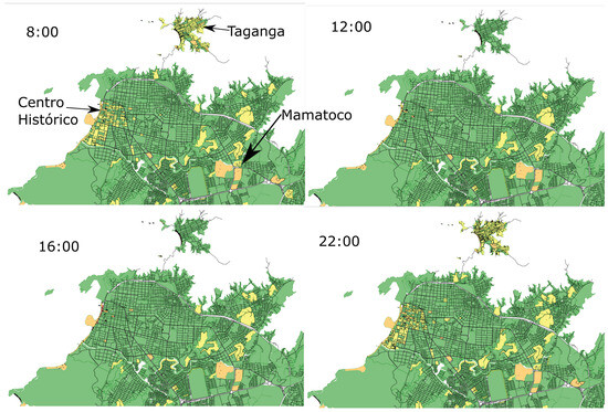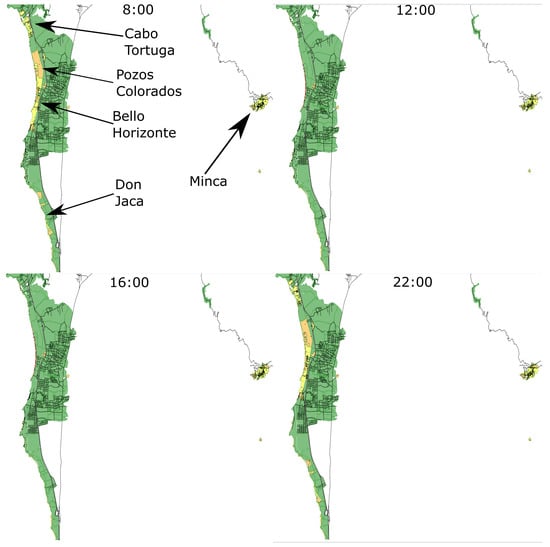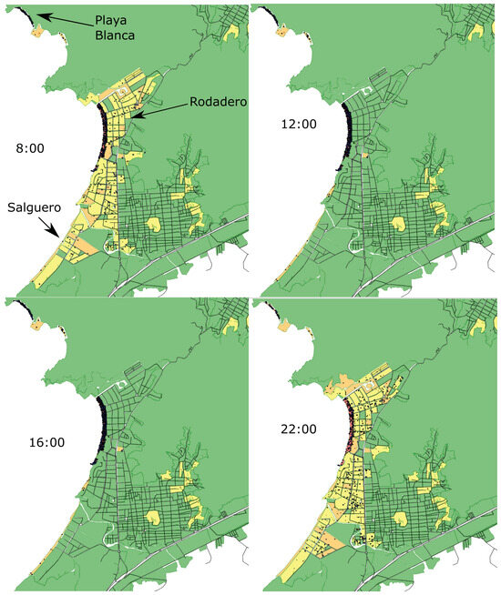 In the temporal scales, the model allows observing temporal changes at a minimum scale (hours) and a maximum (year); likewise, it allows observing different spatial scales, from the minimum (MZ) to the maximum (destination). The minimum spatial and temporal scale allows observing changes in the MZ at various times of the day, that is, peaks of increase in population carrying can be observed in tourist sites in the hours of the day between 10:00 and 16:00, and subsequently, its decrease and increase in places of lodging and residence at night. This information may be relevant for the analysis of the effects of overtourism on smaller spatial and temporal scales.