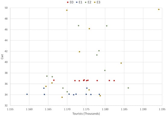 The tourist carrying received by the system () in all the experiments is in a range between 15,549 and 16,025, which corresponds to a range of (see Table 11). The density of tourists shows the changes in the pressures generated by tourism on the scale of the tourist interest zone (ZIT) in front of the proposed scenarios.