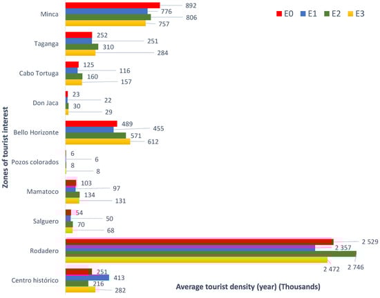 When comparing with , it is observed that the measure causes a decrease in the average density of tourists in Minca and the Centro Histórico; on the contrary, in the rest of the ZITs, the average density of tourists increases. This is the result of the spatial reassignment of tourists from small tourist attractions located in the Centro Histórico and Minca to the rest of the sites in the destination (see Figure 10). When comparing with respect to , it is observed that the measure causes a decrease in the average density of tourists in Minca and Rodadero; on the contrary, in the rest of the ZITs, the average density of tourist increases (see Figure 10).
