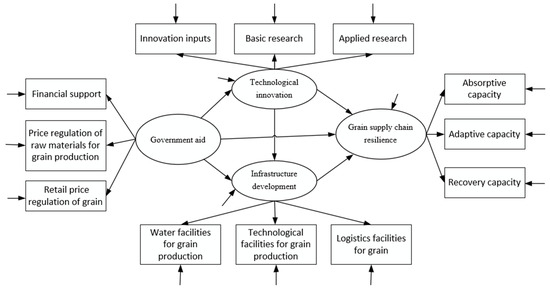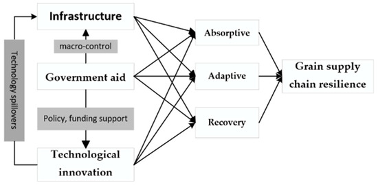 The concept of GSCR is embedded in the context of multiple overlapping risks; therefore, it is insufficient to consider only the direct impacts of individual factors. Instead, the cross-cutting effects of infrastructure, technological innovation, and government aid must be analyzed. First, government aid can indirectly enhance GSCR through support for infrastructure development and investment in technological innovation. The construction of high-standard farmland and water conservancy infrastructure, as well as grain scientific research and technological innovation, requires substantial investments in capital, manpower, and time. These tasks cannot be accomplished by a single entity; thus, the government is crucial in coordinating and unifying the efforts of all stakeholders. For instance, the People’s Republic of China Act on Food Security, enacted on 1 June 2024, stipulates that ‘the State shall strengthen scientific and technological innovation capacity for food security and information technology construction, and shall support basic research, key technology R&D, and standardization in the grain sector’. Additionally, it mandates that ‘governments at all levels shall organize the construction, operation, and maintenance of farmland water conservancy infrastructure, protect and improve irrigation and drainage systems, and promote efficient water-saving agriculture based on local conditions’. These provisions underscore the government’s critical role in ensuring grain supply and national food security. Second, technological innovation directly influences infrastructure construction by improving operational efficiency, promoting the restructuring and upgrading of the GSC, and enhancing its capacity to absorb, adapt to, and recover from risks, thereby strengthening the GSCR. In summary, three testable propositions are formulated: