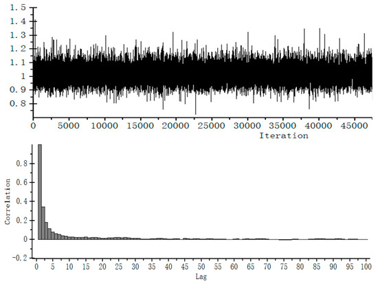Using Amos Graphics 24.0 software, we calculate the Bayesian estimation by substituting the normalized data into the above SEM. Figure 3 shows a randomly selected sequence of parameter plots at different initial values, as well as autocorrelation plots, to reveal the convergence. The figure illustrates that the procedure was iterated 45,000 times and converged at 5000 iterations. We collect 5000 observations after convergence to produce the estimates and their standard errors.