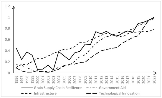 Based on the parameter estimation results, the standardized path coefficients of each latent variable in the model are normalized to derive the corresponding weights of each indicator [42]. Using Formula (where represents the weight of the ith observation indicator for the jth latent variable), the levels of China’s GSCR, infrastructure, government assistance, and technological innovation from 1996 to 2022 are calculated. The results are presented in Figure 4. Regarding temporal trends, China’s GSCR declined gradually from 1996 to 2003, reaching its lowest point in 2003. From 2003 onwards, the resilience level exhibited an overall upward spiral trend, with a notable surge after 2006 and a significant jump in 2018. In 2003, China explicitly prioritized the resolution of the ‘three rural issues’ (agriculture, rural areas, and farmers) in official documents for the first time, marking it as a top priority for the Party and government. Additionally, a pilot direct subsidy policy for grain production was implemented. In 2006, the ‘No. 1 Central Document’ and the ‘Two Sessions’ introduced a series of measures, including the abolition of agricultural taxes and the provision of loan support for grain circulation to grain enterprises. These policies revitalized China’s grain production and distribution systems.