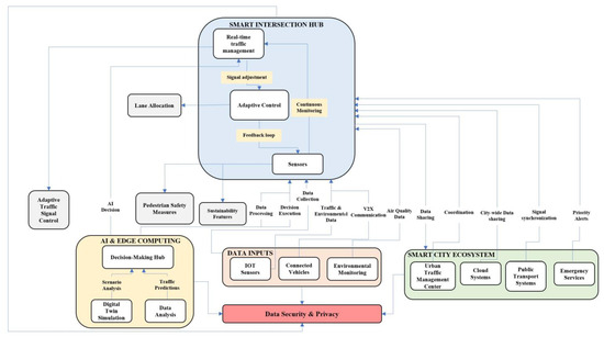 As depicted in Figure 4, smart intersections for urban environments are designed for efficiency and technological progress. The core of the structure is the Smart Intersection Hub which uses adaptive methods for traffic control dynamic management and sensor-based monitoring to adjust signals continuously. The setup integrates AI and edge computing to support decision-making through scenario evaluation and data-based forecasts for traffic flow. Data collected from vehicle-mounted sensors and environmental monitoring devices are vital in enhancing AI-powered traffic control methods. The system includes adaptive traffic light systems, pedestrian safety protocols, and dynamic lane adjustments to optimize traffic flow, promoting sustainability and operational efficiency. Furthermore, it seamlessly integrates into the smart city infrastructure, working cooperatively with traffic management hubs, cloud services, public transport networks, and emergency response units. This ensures Vehicle-to-Everything (V2X) communication, air quality monitoring, and real-time data exchange across the city. By fostering a data-driven traffic infrastructure, this framework aligns with the overarching goal of establishing eco-conscious urban transportation networks.