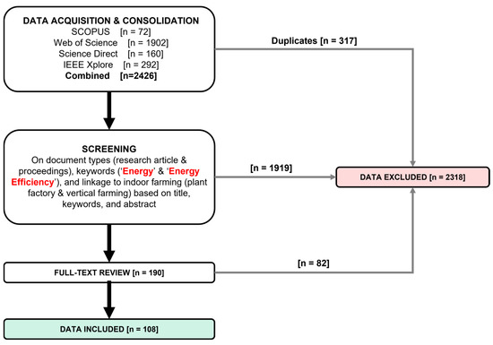 There were 2426 available scientific studies found in online databases. These were manually checked for duplication, document or article type, and relevance (Figure 1). Duplicate titles and DOIs were identified using a filter and equation and were removed. The compiling of the search was limited to research articles, case studies, conference proceedings, brief reports, and methodology articles. Review articles and books were excluded. The relevance screening was conducted based on the documents’ titles, keywords, and abstracts. Documents unrelated to ‘Energy’, ‘Energy efficiency’, and indoor farming, PFs, and vertical farming were excluded. Finally, the PDF copies of the remaining records were downloaded and reviewed in full text. Out of 2426 searched documents, 108 were included for comprehensive review.