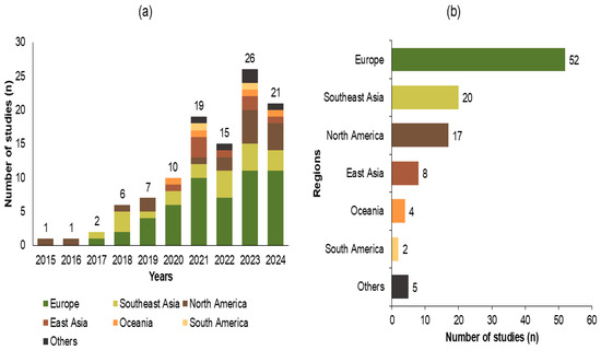 Annual publication trends (a) and regional distribution (b) of studies included in the review.