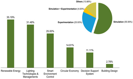 The primary solutions for reducing energy costs in vertical farming involve integrating renewable energy, enhancing lighting efficiency using advanced lighting technologies and effective lighting management, and implementing automation for environmental control. These solutions were addressed in over 90% of the studies reviewed (Figure 3). Additionally, the incorporation of vertical farms into urban systems and the use of residual waste from other industries to promote a circular economy were also discussed. However, a limitation of our review is that most of the study results (55.56%) were generated from simulations or modeling. Only 25.93% of the studies were experimental, primarily conducted in small-scale vertical farms or growth chambers, focusing mainly on lighting quality and management evaluations. The remaining studies presented proposals and prototypes of technologies deemed applicable to energy efficiency on vertical farms.