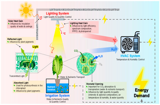Interaction between plant processes, lighting, HVAC, and irrigation systems in a controlled environment.