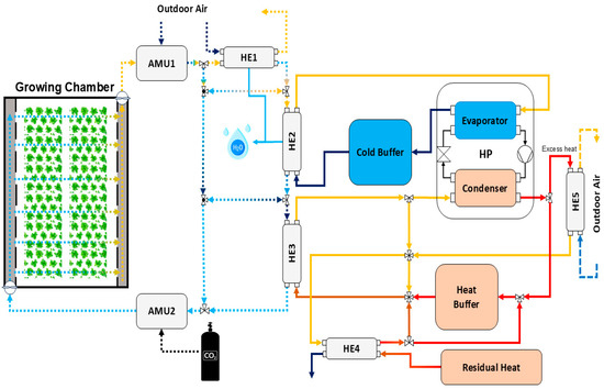 Several HVAC system designs have been reviewed, but in this study, we created a closed-loop design mainly inspired by Blom et al. [114,123], and incorporating other energy-efficient ideas (Figure 5). The HVAC system utilizes several heat exchangers (HEs) for indirect reconditioning of exhaust air. Their design and size must be optimized for efficient heat transfer [14]. Furthermore, the system has modular features that undergo economy mode [25,108] which utilizes favorable outdoor air (dry and cooler or close to set growing temperature) and mixes it with exhaust air in air-mixing unit 1 (AMU1). Additionally, the system supports cooling-only, reheating-only, or cooling–dehumidification–reheating processes, depending on the conditions of the exhaust air, which are facilitated by bypass mechanisms [14]. Finally, the reconditioned air will go to air-mixing unit 2 (AMU2) for CO2 enrichment and will then be evenly distributed throughout the growing chamber, ensuring uniform airflow across the entire area. Dehumidification is achieved by cooling exhaust air below its dew point to condense moisture in the air [14,114,123] and this is taken in either by air-to-air heat exchanger 1 (HE1) or air-to-water heat exchanger 2 (HE2). The water collected in HE1 and HE2 is to be repurposed for irrigation. During cold seasons, outdoor air is used for cooling only or cooling and dehumidification in HE1, leveraging the proposed methodology by Pacak et al. [124] and Jurga et al. [125] for harvesting water from exhaust air. To ensure effective condensation and prevent frosting, the heat exchanger’s temperature must be maintained at 2.5 °C below the exhaust air temperature [124], but can still be further reduced to maximize cooling and condensation as long as it remains above the frost formation point. When outdoor conditions are inefficient for cooling and dehumidification, a water-to-water heat pump (HP) will supplement the process [14,114,123]. The evaporator of the HP is used to cool the exhaust air in the HE2, and the condenser is used to reheat the air coming from either AMU1, HE1, or HE2 in water-to-air heat exchanger 3 (HE3). Additionally, the system can utilize residual heat or an external heat source to reduce condenser workload. This can be added to the heat buffer tank or directly used in HE3 through heat exchanger 4, depending on the temperature requirement and the recovered temperature. HE4 can be either air-to-water or water-to-water, depending on the residual heat source available in the location. Cold and heat buffer tanks are added to the system with mixing values to allow temperature variations within the system while maintaining uniform internal conditions [114]. The excess heat produced by the HP during low heat demand is expelled through water-to-air heat exchanger 5 (HE5) to the outside of the building or repurposed for heating other facilities for energy synergy [114]. Additionally, aquifer thermal energy storage (ATES) can be integrated to store the residual heat from the HP during summer and retrieve it to utilize during winter [114]. However, its efficiency depends on geological and hydrogeological conditions and requires a high initial cost, which limits its application. The HVAC system we designed has complex features that require complex control. However, integrating AI into the control system would be more effective and efficient. Additionally, optimizing the design is recommended to make the HVAC system more compact and space-saving, and it should be tailored to the local environment. In addition to precise control of environmental conditions, the uniformity of airflow distribution must be considered when designing PFs. The ventilation design needs to be optimized to minimize variations in air conditions between upper and lower tiers and areas that are farther or closer to walls to enhance uniformity and crop growth rates while reducing energy consumption [121].
