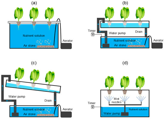 Types of irrigation systems: hydroponic (a) deep-water culture, (b) ebb-and-flow system, and (c) nutrient film technique; and (d) aeroponics.