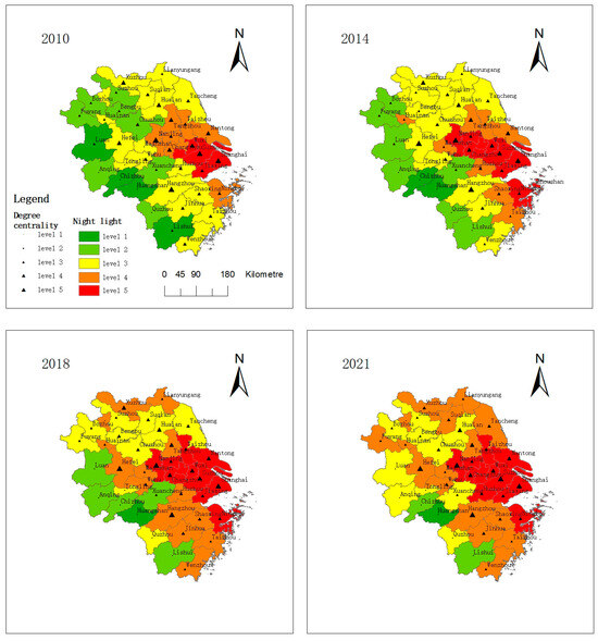 ArcGIS 10.7 software drew the network node centrality and economic growth level of the Yangtze River Delta urban agglomerations in 2010, 2014, 2018, and 2021. With 2010 serving as the base period, the natural breakpoint method was used to visualize the strength of the two urban agglomerations. The size of the city point represents the degree center, and the different colors of the administrative area represent the strength of the night light.