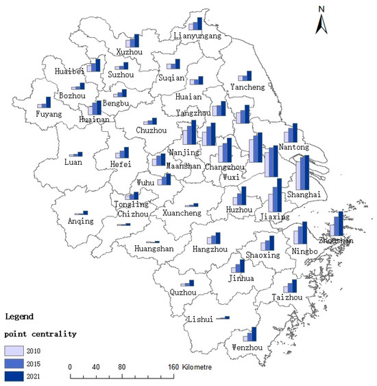 The degree centrality of each city in 2010, 2015, and 2021 is shown in Figure 2. The results show that Shanghai, Nanjing metropolitan area, Hangzhou metropolitan area, Hefei metropolitan area, Suxi-Xi-Chang metropolitan area, and Ningbo metropolitan area have a higher degree of urban centrality, and the network pattern of “one core and five circles” is obvious in the Yangtze River Delta region. The degree centrality of cities in the Yangtze River Delta urban agglomerations varies greatly. Shanghai, has the highest degree of centrality, with a value of more than 12 times that of the city with the lowest degree of centrality. Among the cities, the degree centrality of Chizhou City, Huangshan City, Chizhou City, Lu’an City, and Lishui City are lower. The degree centrality of the western Anhui, western Zhejiang, and northern Jiangsu regions is relatively low, indicating that the polarization phenomenon in the Yangtze River Delta urban agglomeration is relatively serious, and the degree centrality of the central region is generally higher than that of the surrounding areas. The degree of centrality of different cities presents different rules. Overall, the degree centrality of cities in the upper and right half of the Yangtze River Delta urban agglomeration has a significant growth trend, while the degree centrality of individual cities in the southwest is not obvious, indicating that the network status of each city node in the Yangtze River Delta multi-center urban network is generally improved. The network status of regional multi-center nodes is constantly improving.