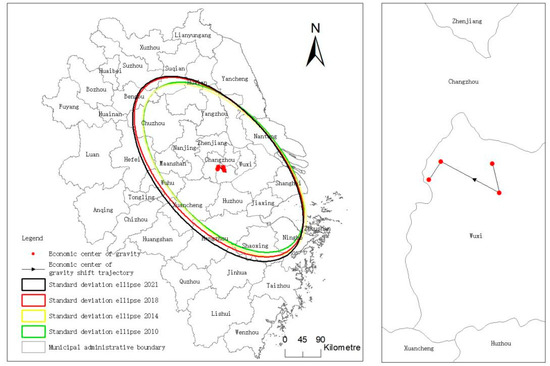 In Figure 3, through the analysis of the standard deviation ellipse of urban economic growth level in 2010, 2014, 2018, and 2021, it can be found that the standard deviation ellipse is distributed in the direction of northwest to southeast as a whole, indicating that the development direction of the urban agglomeration in the Yangtze River Delta region is stable. From 2010 to 2021, the spatial range of the standard deviation ellipse expanded, and the long and short axes appear increased. From 2010 to 2014, the center of gravity coordinates of the ellipse shifted from 119.72° E~31.52° N to 119.75° E~31.45° N in the southeast direction, and the Yangtze River Delta urban agglomeration developed toward the southeast cities. From 2014 to 2018, the center of gravity coordinates of the ellipse shifted from 119.75° E~31.45° N to 119.61° E~31.52° N in the northwest direction, with little change in the overall spatial range. From 2018 to 2021, the center of gravity coordinates of the ellipse shifted from 119.61° E~31.52° N to 119.58° E~31.48° N in the southwest direction, the space range of the standard deviation ellipse became significantly larger, and both the long and short axes increased, indicating that the Yangtze River Delta urban agglomeration developed to the southwest Anhui region during this period.