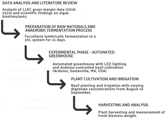 The research methodology was structured to provide a comprehensive approach for the development of a prototype algae extract from the digestate of Furcellaria lumbricalis and evaluate its potential as a biostimulant in agriculture. The methodological approach involved several consecutive and interrelated steps. Figure 1 illustrates the process of developing an algae extract prototype, including data analysis, raw material preparation, experimental stages, plant cultivation and final analysis.