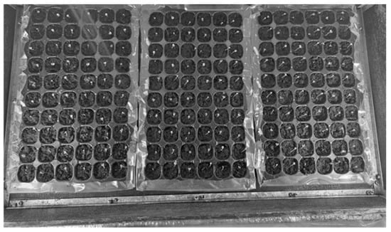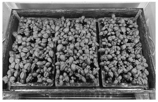 The experimental phase was carried out in a custom-built, specially designed automated greenhouse (900 × 550 × 410–570 mm) equipped with LED lighting and microcontroller-operated environmental regulation. The greenhouse equipment included programmable controls, specialised broadband (IR-UV) LED plant growth bulbs, air and soil humidity control and humidification equipment, ventilation and temperature control. Figure 2 shows the arrangement of the plants in the cassettes during the cotyledon development phase.