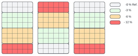 After the fermentation process, the digestate was used in a test experiment carried out in an automated greenhouse where constant conditions of light, temperature and humidity were maintained to ensure objective results. The greenhouse was divided into three zones, with each zone treating basil plants with a diluted digestate concentration of 0% (pure water—control group), 3%, 6% and 12%. Figure 3 shows the distribution zones of application for the different concentrations.