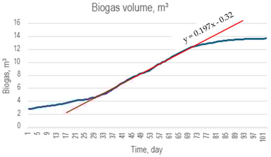 During the digestion process, biogas was obtained that can be used as an energy source for heating, thermal processes for algae processing or other purposes (storage for disposal). The following results present original experimental data from our anaerobic digestate production process using Furcellaria lumbricalis collected from the Baltic Sea. All production parameters, measurements and analyses were conducted by the authors. Figure 4 provides a graph of the volume of the biogas produced under normalised conditions—temperature, pressure. The duration of the process was about 100 days, and the active phase was started late due to low temperatures; however, the output of biogas between the 30th and the 70th day is estimated at 0.197 m3/day from the 1.227 kg of algae Furcellaria lumbricalis used in the process.