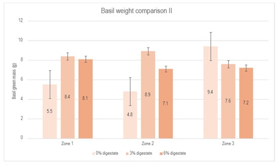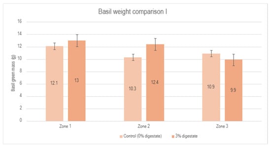 These results indicate a small but measurable positive effect of applying a 3% digestate concentration in basil cultivation. A detailed visual representation of these results, including a comparison of different zones and percentage changes between the control group and the 3% digestate group, is shown in Figure 6.