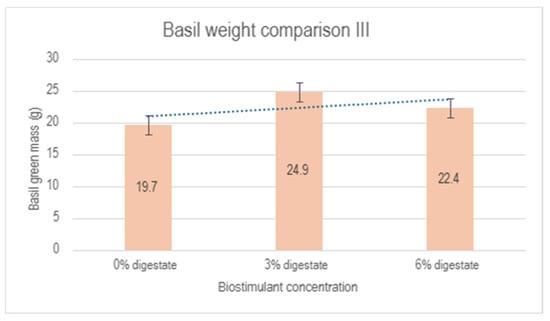 The first experiment compared basil plants irrigated with a 3% digestate concentration to the control group, which received pure water (0% digestate). The results showed that the application of 3% digestate concentration enhanced crop growth compared to the control group. Measurements of the total green mass of basil revealed the following results: (1) green mass weight of basil in the 3% digestate group: (35.3 ± 0.1) g; (2) green mass weight of basil in the control (0% digestate) group: (33.3 ± 0.1) g.
