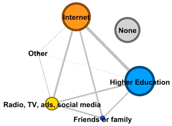 Regarding the students’ understanding of the CE concept, Question 10 allowed multiple-choice answers: higher education, Internet, radio and/or TV, family and friends, and none. Figure 1 represents the different combinations of answers selected by students, where each link represents two answers selected together. The visualisation obtained with the Gephi software facilitates the non-linear process of discovering information, focusing on the visualisation of the network that connect the nodes in order to highlight the information that stands out from the other elements [22]. Most respondents, 74%, chose one option, while the remaining 26% chose more than one option. Of the respondents who chose more than one answer, 64% selected two options, 26% selected three, and 10% chose four answers. In Figure 1, the width of each connection represents the frequency with which each pair was selected (the thickness of the lines is directly proportional to the number of answers). The more frequent combinations were pairs among ‘Higher education’ and ‘Internet’. This multiple-choice question revealed that most students came into contact with the concept of the CE in an academic environment, followed by the Internet, radio, TV, and ads. As expected, and similarly to the studies conducted by Dewi, Arfani, and Herawan [24], Antovska-Mitev and Drangovska [25], and Alves et al. [17], students’ leading sources of information on the concept of the CE were academia and the Internet. Dewi, Arfani, and Herawan’s study [24] reveals equal percentages for these two sources, and Alves et al. [17] show that social media is the primary source. In contrast, the present study demonstrates that academia is students’ primary source of information. The answers also showed a significant percentage of students who have never heard about the CE (26%). Regarding HE students’ lack of knowledge of the concept of the CE, the Portuguese study by Alves et al. [17] indicates similar values. Other studies present lower percentages [24] and higher percentages for the lack of knowledge of HE students on the CE concept [13,26].