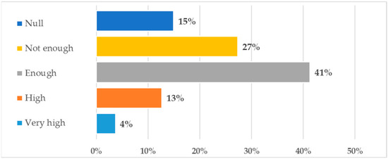 In Question 8, the students were asked to identify their level of knowledge of the concept of the CE (Figure 2). These results show that 41% of respondents stated they had sufficient (enough) knowledge of the CE; 17% stated they had very high knowledge (4%) or high knowledge (13%). However, 27% stated they did not have sufficient knowledge, and 15% stated they did not know (null) the concept of the CE. Question 8’s median is two, and the IQR is one. The median value for the older age group (over 30 years) and the scientific areas ’Business, administration, and law’ and ‘Agriculture, Forestry, Fisheries, and Veterinary’ is three. These results align with those of the study conducted by Alves et al. [17] on university students in Portugal, confirming that Portuguese HE students have a low to moderate level of understanding of the concept of the CE. These outcomes highlight the importance of integrating CE and sustainable development topics into the curricula of different courses at HEIs [27,28].