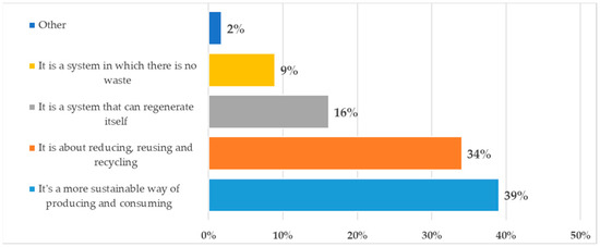 In Question 9, students were asked to choose one of four statements that, in their view, best suited the CE concept. Figure 3 presents the responses distribution: 39% of students associate the concept of the CE with a more sustainable way of producing and consuming, followed by 34% who stated it is about reducing, reusing, and recycling; 16% answered that it is a system that can regenerate itself; and only 9% responded that it is a system in which there is no waste. Respondents were also allowed to indicate another definition not included in these sentences, but these answers accounted for less than 2% (Figure 3).