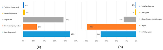 Concerning Question 11 (Figure 4a) on the importance of disseminating actions promoting the CE, a high percentage of students, 84%, stated it is ‘important’ (39%) or ‘very important’ (45%) to disseminate this kind of action. In comparison, only 3% of the students declared that these actions are ‘not so important’ (2%) or ‘nothing important’ (1%) (Figure 4a). Thus, it can be said that the students surveyed generally have a favourable attitude towards the importance of publicising actions related to the CE. The median value is four and the IQR is one. It should be noted that the majority of master’s students and older age groups (26 to 30 years and over 30) responded that, from their perspective, it is very important to publicise CE actions. It should be noted that most master’s students and the older age groups responded that, from their perspective, it is very important to disseminate CE actions, which reveals the concern of the older groups with disseminating this type of information. In the group of working and non-working students, the analysis of the median reveals values of 5 and 4, respectively, which shows that students in the labour market are more aware of the importance of disseminating CE actions.