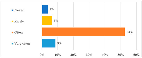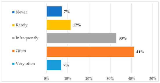 Figure 9 presents students’ opinions regarding promoting CE practices in their institution (Question 18). In Figure 9, it can be seen that 41% of students responded often and 7% responded very often. However, 52% of students responded infrequently, rarely, or never. In Question 18, the median value is 3 and the IQR is 1. For this question, no significant differences were observed in the distribution of responses across all variables.