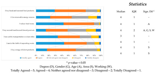 The CE practices most mentioned by students were “reducing food waste” (90%), “separating waste” (78%), “buying local and seasonal food” (77%), and “using public transport” (68%). Most answers demonstrated agreement (median = 4), except for the statement related to buying second-hand or reconditioned goods, in which most of the respondents revealed neutral answers (median = 3). The answers had IQR = 1, except for the statement about reducing food waste, which had a greater dispersion (IQR = 2). The distribution was equal in the categories of age, gender, scientific area, degree, and status of working/non-working students. As shown in Figure 6, most of the answers correspond to a simple agreement with the presented statements, which shows that the respondents recognise the importance of adopting habits related to the CE. As to whether they are in the habit of reducing food waste, significant differences were observed in the distribution of responses across age groups, genders, scientific areas, and working or non-working students. Students in the following groups were more likely to agree (Figure 6): age group of 17 to 21 years (60%), female gender (56%), scientific area of ‘Health and Welfare’ (62%), and non-working students (73%). Significant differences were observed in the distribution of responses across age groups on the statement related to using renewable energy sources. Students aged 17 to 21 years were more likely to agree (58%). When asked if they regularly separated waste, significant differences were observed in the response distribution across scientific areas. Students in the ‘Engineering, Manufacturing, and Construction’ field were more likely to agree (26%). Similarly, there were notable differences in response distributions across scientific areas regarding the question about purchasing energy-efficient products (26%). There were notable differences in the distribution of responses based on scientific area on the question related to buying energy-efficient products. Students in the scientific area of ‘Engineering, Manufacturing, and Construction’ were more likely to agree (28%).