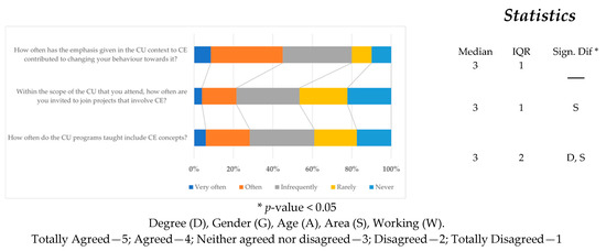 Significant differences in the distribution of responses by scientific area groups regarding participation in projects that involve the CE were observed (Question 17). For students in ‘Information and Communication Technologies’ and ‘Natural Sciences, Mathematics, and Statistics’, the median was 2.