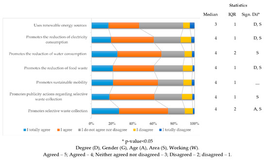 In Question 19, students were asked about CE practices in their HEI, which should involve the integration of sustainable principles into educational programs and campus operations to promote resource efficiency and environmental conservation. The results (Figure 10) show that, in general, students consider that HEIs already implement CE practices. In the students’ opinion, the use of renewable energy is the least implemented practice, as opposed to waste separation, which students consider the most implemented practice. The practice most mentioned by students was “Promotes selective waste collection” (74%), and the practice least mentioned by students was “Uses renewable energy sources” (46%). Regarding the distribution of the responses, most demonstrated agreement (median = 4), except for the statement “Uses renewable energy sources”, in which most of the respondents gave neutral answers (median = 3). The answers to this question had IQR = 1, except for the statement related to selective waste collection and the reduction of water consumption, which had a greater dispersion (IQR = 2).
