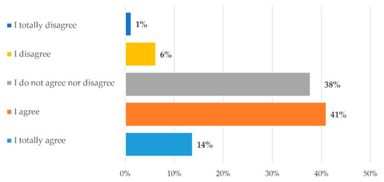In Question 20, students were asked if, in their opinion, teachers have the knowledge to cover content related to the concepts of the CE. Figure 11 shows the distribution of responses, where it can be observed that 14% and 41% totally agree or agree, respectively, that teachers have the knowledge to cover content related to the concepts of the CE. However, of the total of 219 responses, only 74 students (18%) are from the ‘Environment’ and ‘Engineering, Manufacturing, and Construction’ areas.
