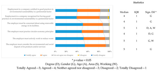 In Question 23, students were asked to classify, on a five-point Likert scale, their level of agreement/disagreement with the following four statements: The employer must consider the environmental and social impacts of its products and/or services (23.1); The employer must actively work to reduce waste (23.2); The employer must practice CE principles (23.3); The employer must be concerned about using renewable energy in its facilities (23.4). In Question 24, students were asked to classify, on a five-point Likert scale, their level of agreement/disagreement with the following two statements: Employment in a company recognised for having good practices in environmental sustainability is a preferential factor (24.1); Employment in a company certified in good practices in environmental sustainability is a preferential factor (24.2).