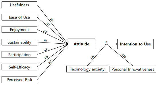 Figure 1 presents the proposed research model. This study explores how attitudes are shaped by perceived usefulness, perceived ease of use, perceived enjoyment, sustainability, consumer participation, self-efficacy, and perceived risk. It also examines the effect of attitude on intention to use and assesses the moderating roles of personal innovativeness and technology anxiety.