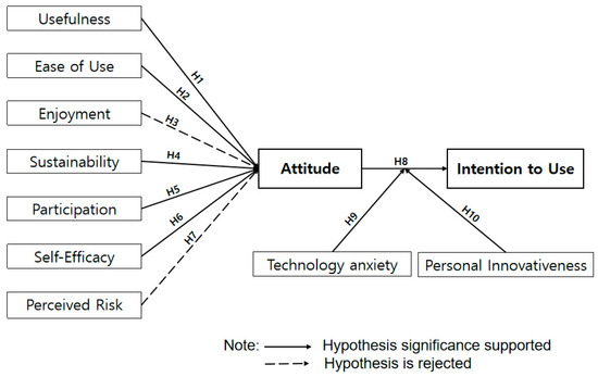 Park et al. [27] and Weijters et al. [28] analyzed the relationships between perceived usefulness, ease of use, enjoyment, and user attitudes by applying the TAM to self-service technology (SST). Their findings showed that usefulness, ease of use, and enjoyment all had a significant positive effect on user attitudes toward SST. Similarly, Lien et al. [29] applied the TAM to SST and found that usefulness and ease of use significantly influenced air passengers’ attitudes toward adopting self-service technology. Guan et al. [30] conducted a study on the acceptance of autonomous vehicles and found that perceived usefulness and ease of use negatively influenced negative attitudes. In another study related to SST, Shim et al. [31] empirically examined attitudes and intentions to use SST using the TAM, confirming that ease of use and enjoyment positively affected attitudes toward SST.