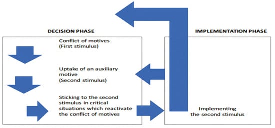 Transformative agency by double stimulation (TADS) is a key notion raised in fourth-generation CHAT research to indicate dialog and collaboration both horizontally and vertically across professional, regional, operational, and administrative boundaries []. As depicted in Figure 3, TADS essentially denotes a cyclical process of self-discovery, self-regulation, and self-enforcement, where individual or collective learners take volitional actions to reformulate their work circumstances and discover their professional capacities. Two stimuli are employed by the learner to develop transformative agency. The first stimulus arises when the learner encounters a dilemmatic situation fueled by conflicting motives because of the division of labor. The second stimulus entails the artifacts to which the learner attaches cognitive and emotional meanings. These artifacts can be tangible items like a clock or a cup of tea, or they can be discursive entities like questions, songs, and discussion topics.