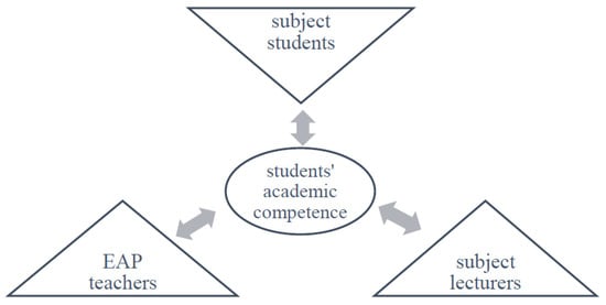In our study, teaching professionals in the field of EAP formulate a particular collective subject due to their scattered or fragmented identity in reality and marginalized status in EAP literature [,]. The prime unit of our analysis is a constellation of three activity systems, including EAP teachers, subject lecturers, and subject students as EAP learners (Figure 5). Bounded by students’ academic competence as the shared object, participants in the three activity systems became collaborative learning subjects. As revealed in our interview data, EAP teachers consulted and collaborated most frequently with teachers and students from the content faculties. Meanwhile, other stakeholders, including the hosting university and the Ministry of Education, constitute a larger context of investigating EAP teacher development.