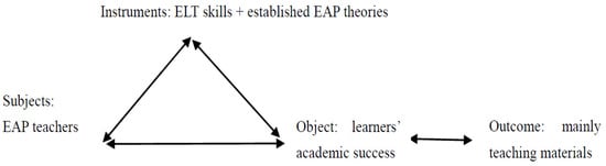 CHAT provides a valuable framework for understanding the professional development of EAP teachers by emphasizing the dynamic and socially mediated nature of teaching practices. As Ding and Bruce [] highlight, EAP teaching is situated within a complex system of institutional policies, disciplinary expectations, and pedagogical practices, all of which shape and are shaped by teachers’ agency. Through the lens of CHAT, EAP educators’ professional growth can be examined as an evolving process influenced by their interactions with students, colleagues, and institutional structures. This perspective allows for a deeper exploration of how teachers navigate tensions and contradictions in their practice, leading to transformative learning and adaptive expertise. Thus, CHAT not only informs research on EAP teacher identity and agency but also provides practical insights into professional development programs aimed at enhancing their pedagogical effectiveness.