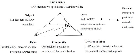 The primary contradiction was identified between the subjects and the object of the EAP activity system. Instead of finding support and forming a concerted effort with research, EAP teachers felt discouraged, frightened, and patronized by the existing EAP literature, which often projected “a condescending and derogatory perception of the practitioner” []. Unsurprisingly, the diverted effort of the two subject groups could hardly support a common object of the EAP activity system. Meanwhile, the goal of serving learner needs was unquestioned by either of the subgroups in EAP.
